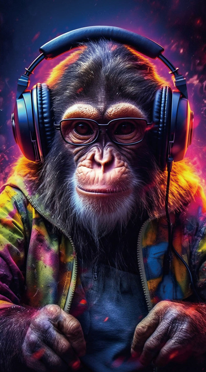 Glasschilderij 55x100cm Aap met blauwe koptelefoon