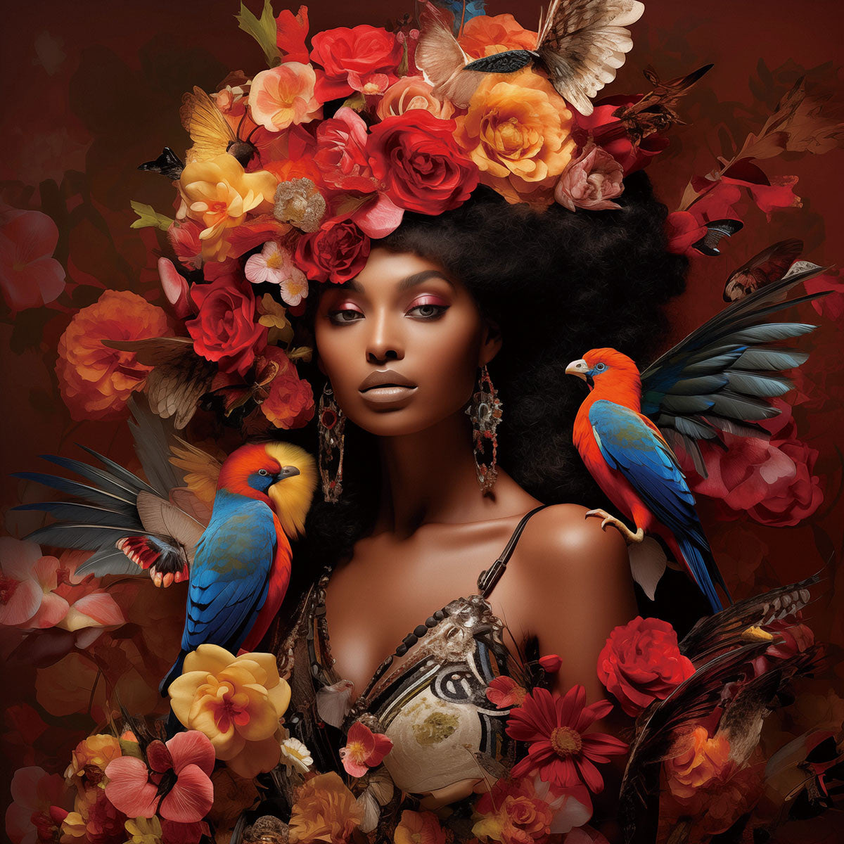Glasschilderij 80x80cm Vrouw met bloemen en vogels