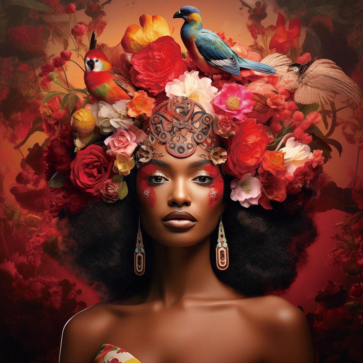 Glasschilderij 80x80cm Vrouw met rode bloemennest