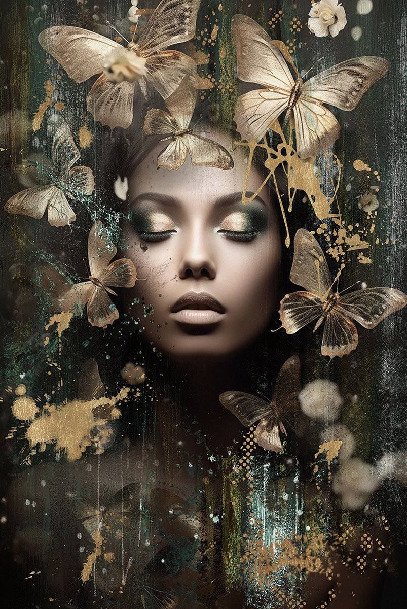 Glasschilderij 80x120cm Vrouw met donkere vlinders