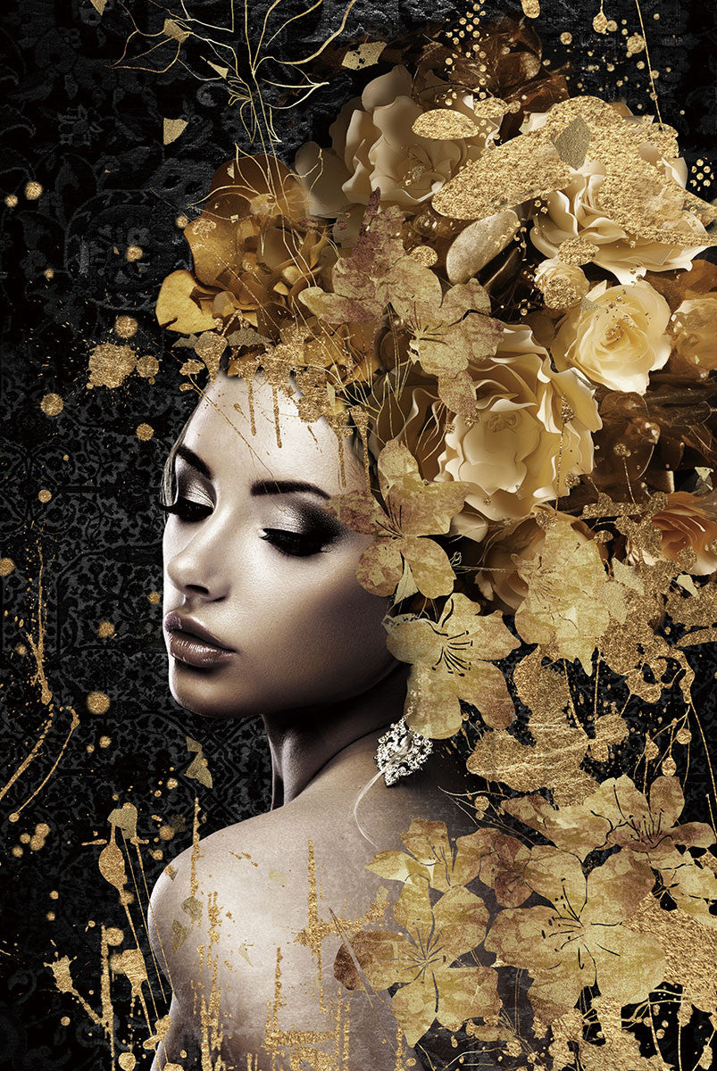 Glasschilderij 80x120cm Vrouw met gouden bloemenstaart