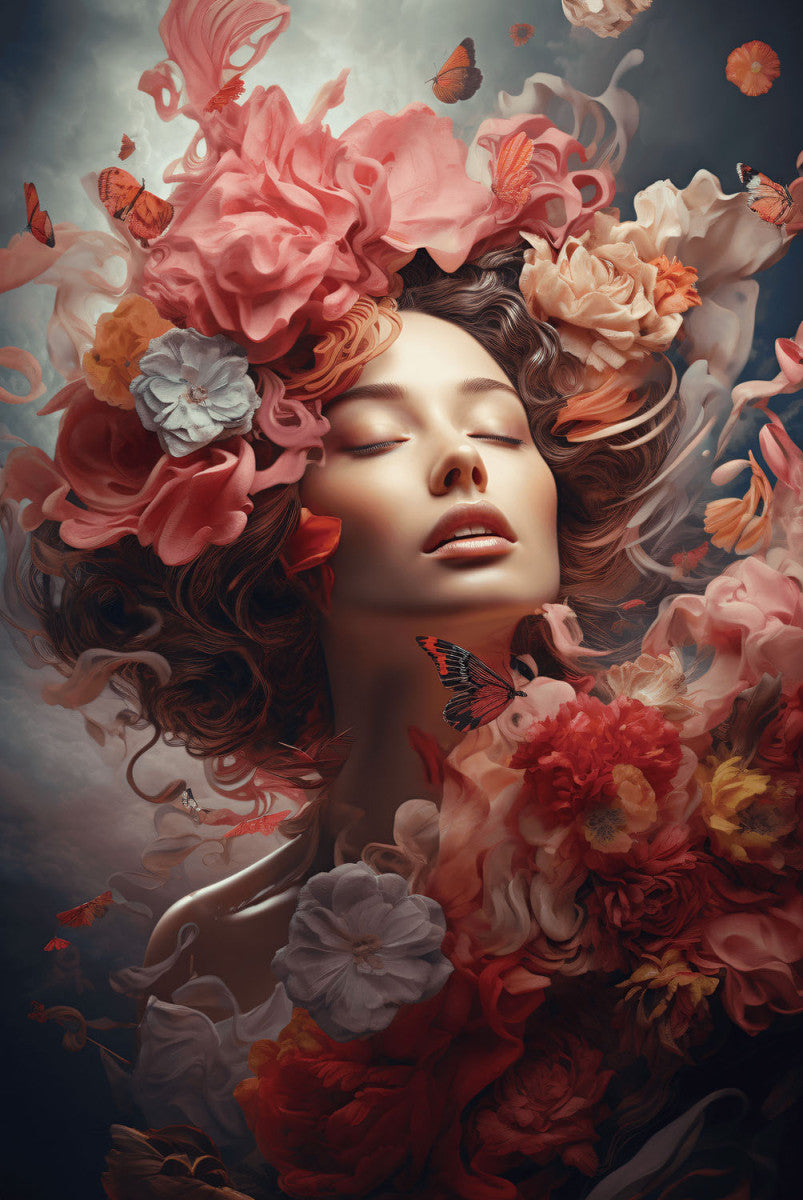 Glasschilderij 80x120cm Vrouw met rode bloemen