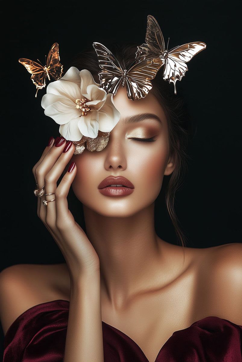 Glasschilderij 80x120cm Fashion dame met vlinders
