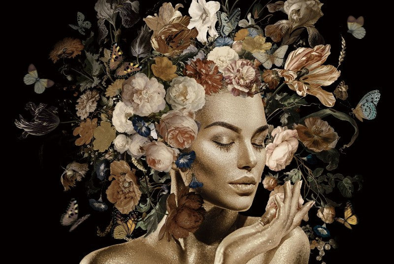 Glasschilderij 120x80cm Gouden vrouw met bloemen