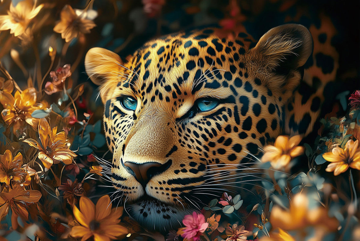 Glasschilderij 80x120cm Panter tussen de bloemen
