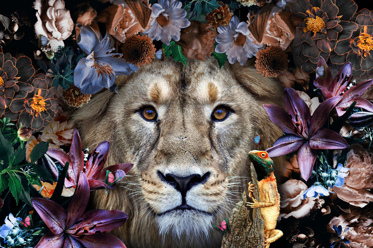 Glasschilderij 120x80cm Leeuw met bloemen midden