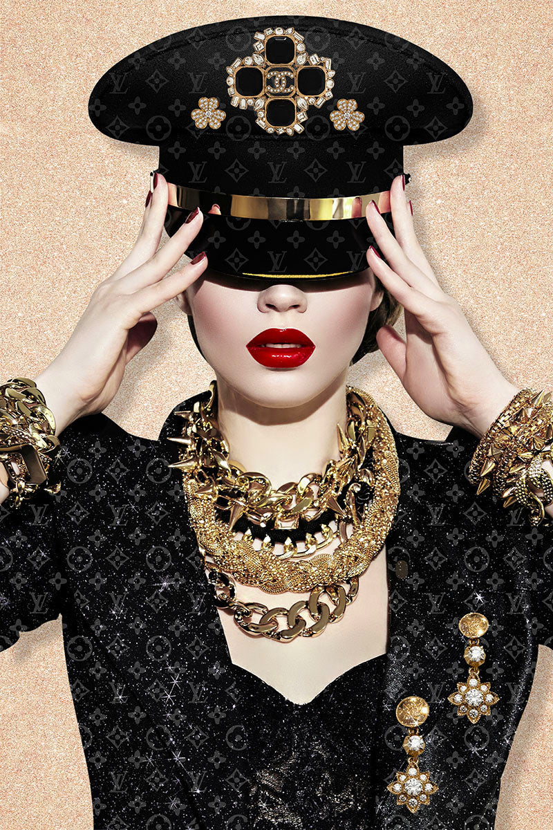 Glasschilderij 80x120cm Vrouw in zwart met gouden sierraden