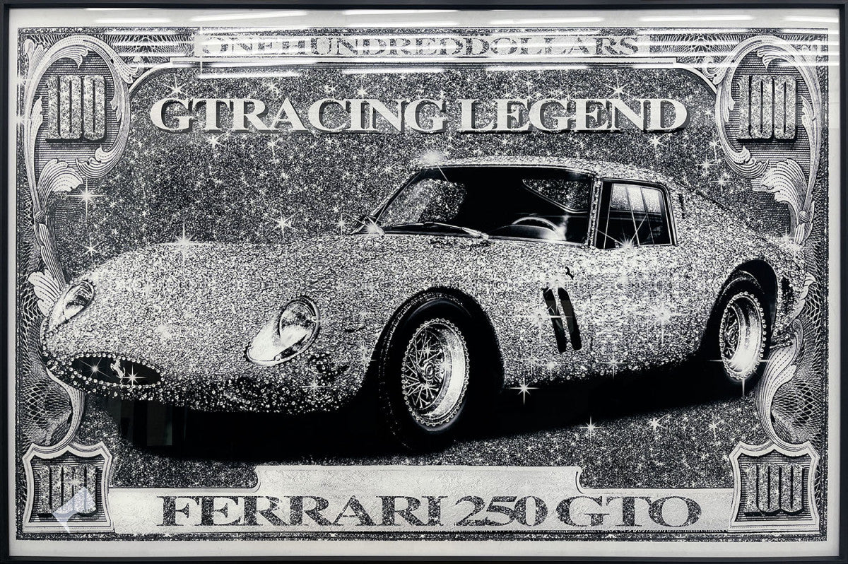 Glasschilderij met kristallen en lijst 120x80cm Auto op briefgeld
