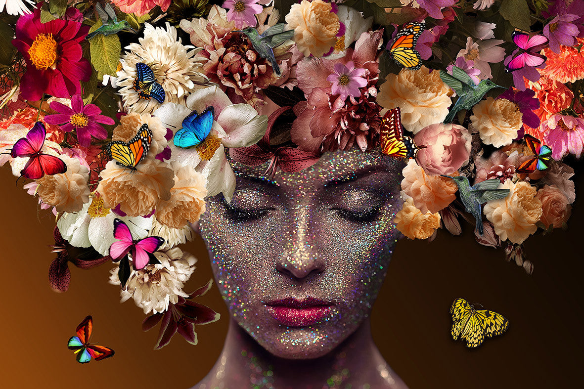 Glasschilderij 160x110cm Vrouw met bloemen en vlinders