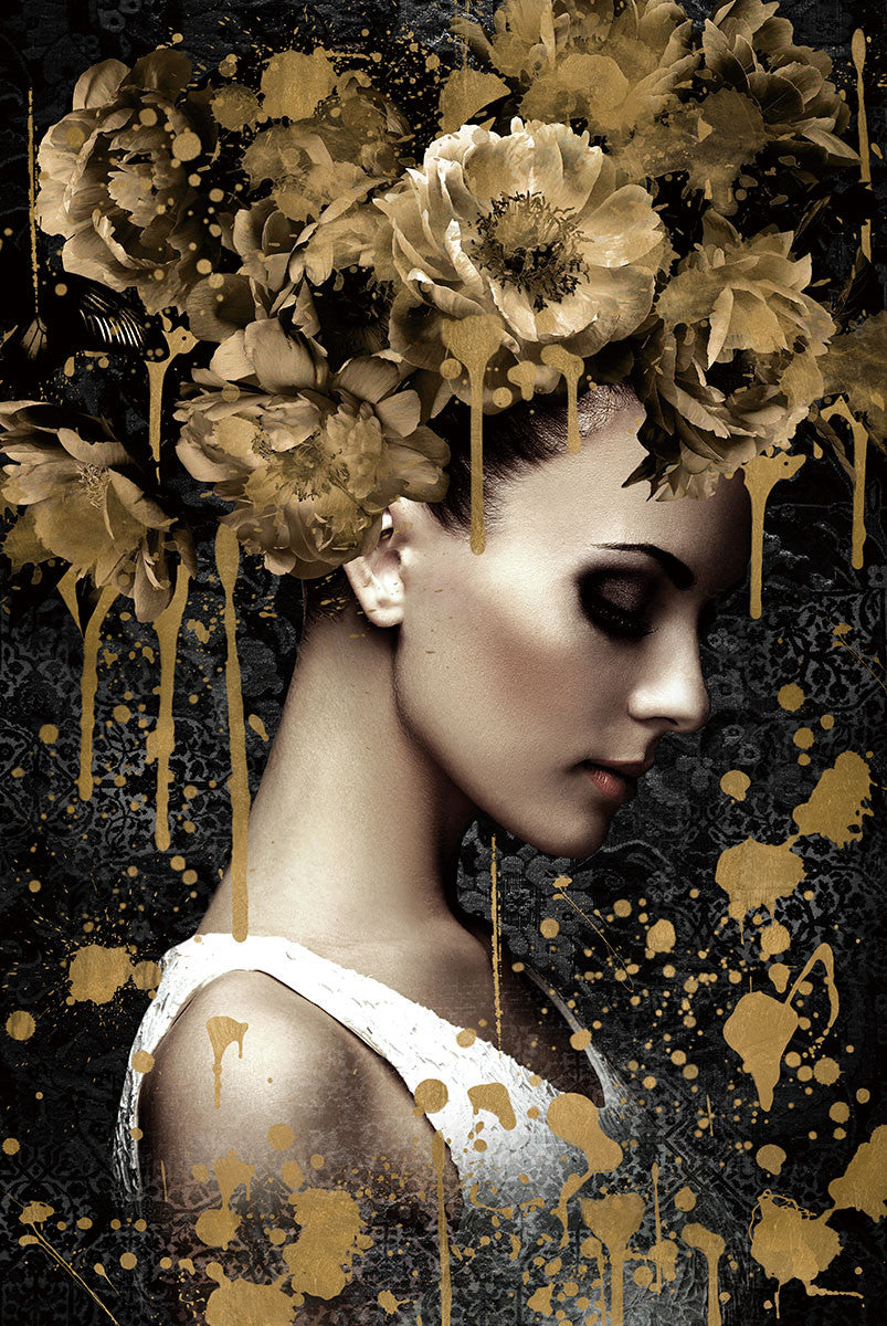 Glasschilderij 110x160cm Vrouw met gouden bloemen